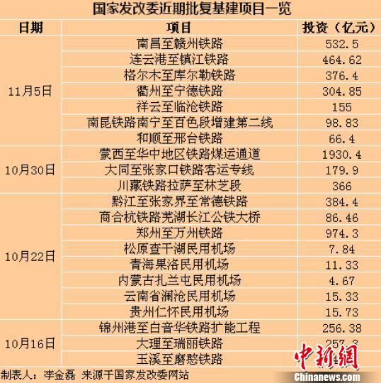 至此,在10月16日到11月5日的21天時(shí)間里,國(guó)家發(fā)改委至少批復(fù)了上述16條鐵路和5個(gè)機(jī)場(chǎng)項(xiàng)目,這21個(gè)基建項(xiàng)目總投資約6933.74億元。