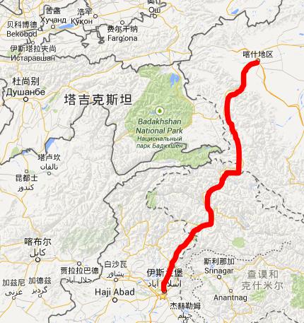 喀什到伊斯蘭堡模擬鐵路線,線路總長(zhǎng)約1196公里。